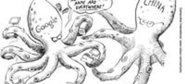 As always, the Germans are much more straightforward in how they express things. They like the erotic feelings they get when watching a cybernetic octopus and an Asian octopus gently and slowly drape their clammy tentacles over each other, in a prelude to mind-blowingly hot cephalo-sex. They look angry at each other now, but that will only make the eventual slimy coupling all the hotter. I can't wait to see the Asian octopus tear off those square glasses with one appendage while using the other seven to sensually caress its lover. Of course, the Germans, ever culturally insensitive, have depicted the Asian half of this mollusktastic fuckfest as China. Silly Krauts, everyone knows that it's the Japanese who are into the tentacle rape!