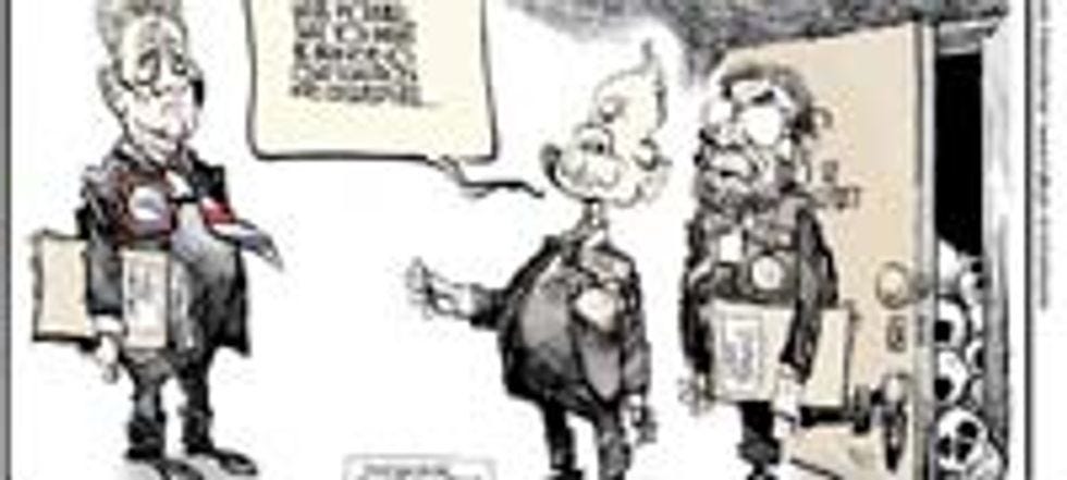 Happy Friday, liberal weenies! Or should I say "suicidally depressing Friday," because all of you are almost certainly suicidally depressed, what with the naked Republican Ted Kennedies and the coming corporate control of all elections and the bankruptcy of your precious liberal radio station ! Anyway, like your liberal weenie foreparents, you will respond to this setback as you have with all others: by sulkily claiming that you're going to move to some more enlightened Foreign country. But of course, you'll never actually do this, because it would be hard, and involve improving on those two years of Spanish you took in high school, but in case you ever get the urge to really, really make the plunge and become an ex-pat, you might want to check on the quality of the Foreigns' political cartoons. They aren't good! Do you really want to be looking at these in your newspaper every day?