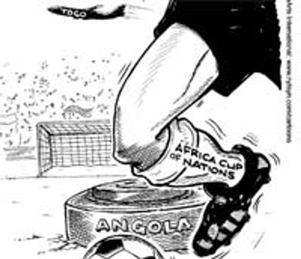 We all know that you probably weren't going to move to Nigeria, because of your racism, but just in case you were thinking about it, you might want to check out this iconographical mess. Here you can see what appears to be the entire nation of Togo flying away from the enormous and terrifying crotch of some soccer player, who has written "African Cup Of Nations" on his sock, to inspire him to glory. In fact, it's just the Togolese soccer team, and it's flying away from the Angola-hosted African Cup of Nations because their team bus got machine-gunned , although you might assume from looking at this cartoon that they actually hit a mine, because of the giant land mine labelled "ANGOLA" right in the middle of the damn drawing. It's possible that having soccer played on fields (or "pitches," as they say among the Foreigns -- get this right if you're planning to move, as there's nothing the Foreigns love more than soccer, or "football") littered with land mines might actually make this sport more interesting, but I assume that this is not the polemical intent of our Nigerian artist. Probably.