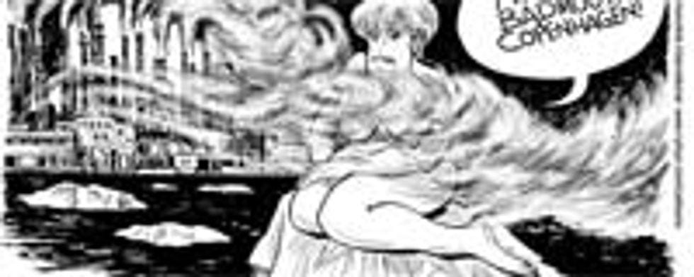 Meanwhile, a naked Angela Merkel lounges erotically on an ice floe somewhere off the coast of one of Germany's most smog-choked industrial towns. She looks uncomfortable -- wouldn't you, if your naked buttocks were parked on some piece of no doubt soot-covered ice? -- but her sense of duty to the Fatherland and the Volk compels her to stay at her post. The Germans associate the bone-chilling Baltic and the sea creatures therein with sexuality, is what I'm getting from these cartoons.