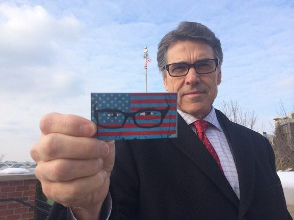And just when we were dusting off our very favorite jokes about Rick Perry: how we used to call him INDICTED former Gov. Rick Perry, and how those S-M-R-T glasses to look like he was more smarter didn't help him sound smarter, and ... and ... oops, we forgot the third thing. (Never. Gets. Old. NEVER.)