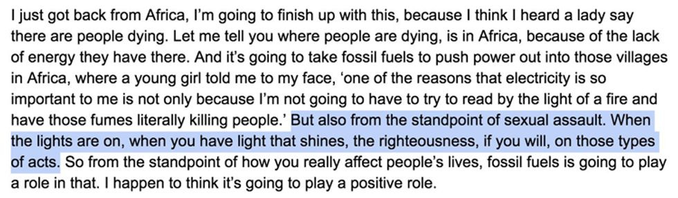 So that's one hell of a stretch, getting from fossil fuels to preventing sexual assaults, which seem not to have vanished from the fully electrified US America or Europe. There's a certain intuitive logic in claiming that street lighting will reduce crime in general -- including sexual assault -- although some research even casts doubt on the commonsense idea that well-lit streets = safer streets. The research on how effective the light of righteousness is at preventing sexual assault is even murkier. Like Rick Perry's logic.