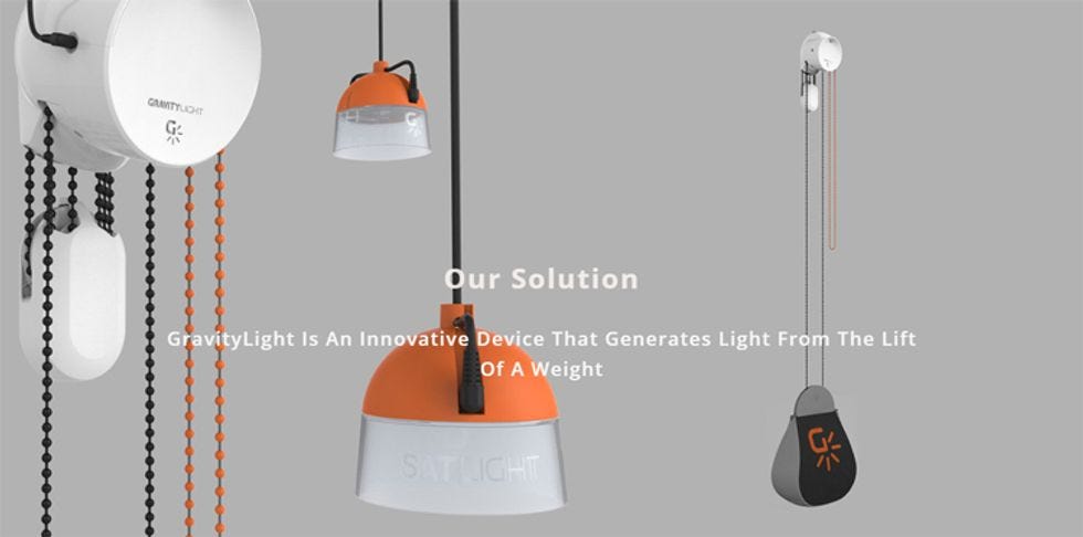 There are all sorts of competing ideas for clean generation of light for individual homes, like this nifty startup, GravityLight, that aims to replace dirty kerosene lamps in Kenya with lights powered by small generators that run off a descending weight, like a modern version of a weight-wound clock, minus the springs: