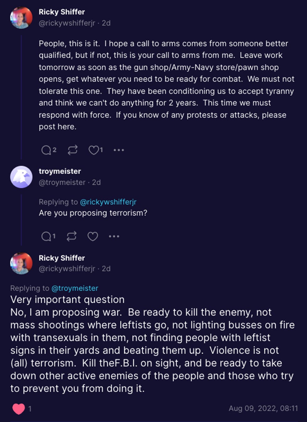"People, this is it," read a post from an account (@RickyWShifferJr) allegedly belonging to Shiffer on Truth Social on the day the FBI raided Mar-a-Lago. "I hope a call to arms comes from someone better qualified, but if not, this is your call to arms from me. Leave work tomorrow as soon as the gun shop/Army-Navy store/pawn shop opens, get whatever you need to be ready for combat. We must not tolerate this one. They have been conditioning us to accept tyranny and think we can't do anything for 2 years. This time we must respond with force. If you know of any protests or attacks, please post here."