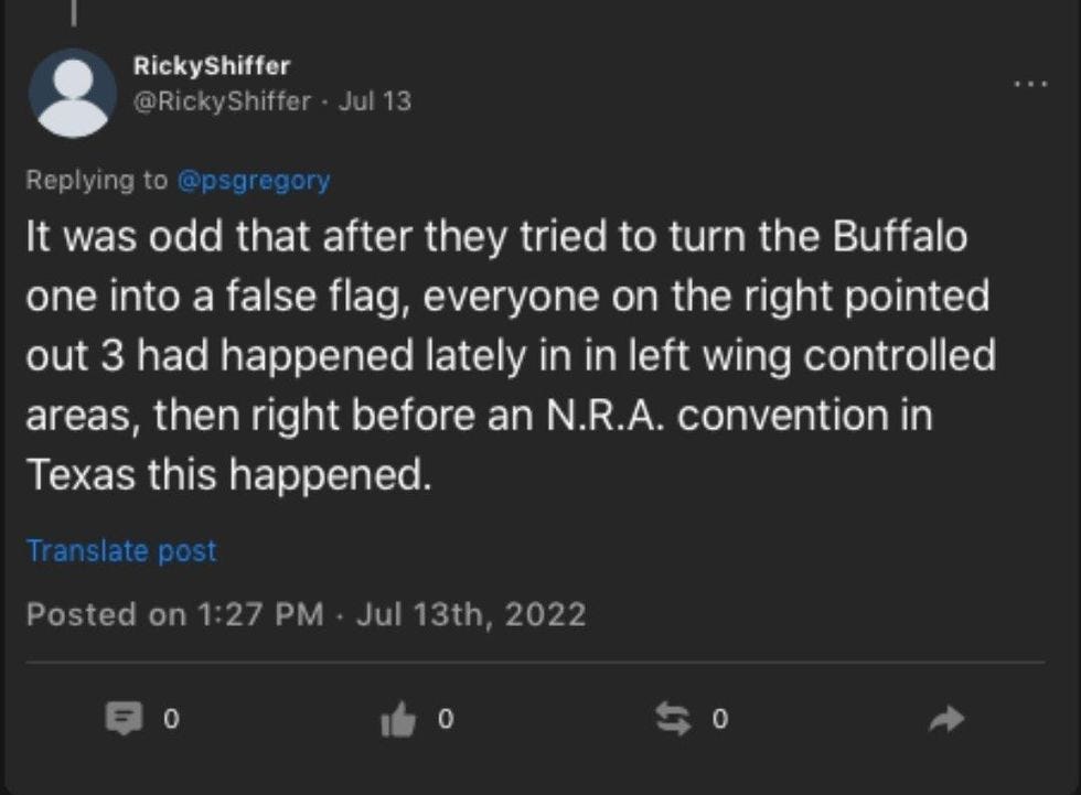 "It was odd that after they tried to turn the Buffalo one into a false flag, everyone on the right pointed out 3 had happened lately in in left wing controlled areas, then right before an N.R.A. convention in Texas this happened," Shiffer wrote on his presumed Gettr profile.