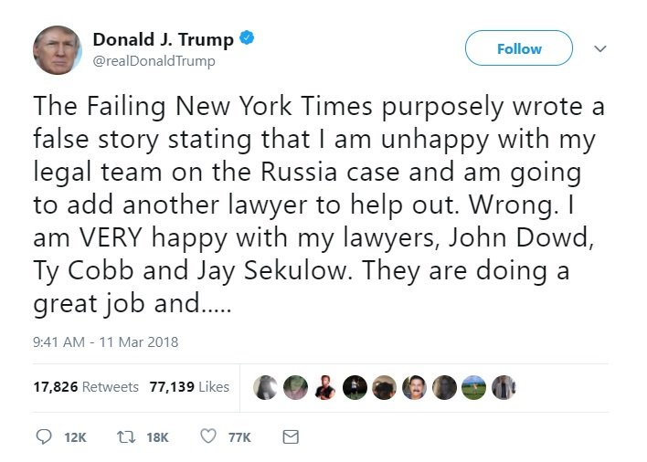 Haberman goes on to report that Trump advisers have tried to see if any other good laywers might be interested in joining Trump's team, but that all the good lawyers in America are washing their hair that day.