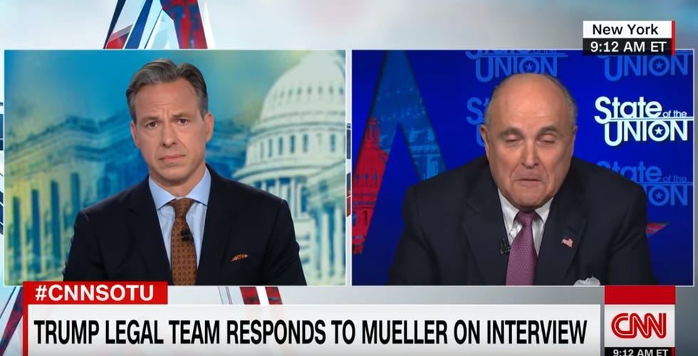 Later in the interview, Jake Tapper, perhaps worried Giuliani was having a mental break right there on live TV, played tape of Giuliani saying the thing Giuliani now says he never said, and you won't believe this, but Giuliani did not actually say, "Oh, I guess I did say that, what a total fuckup I am!" He said he was simply talking about "Comey's rendition" of what happened in that meeting that totally didn't happen. Giuliani also law-splained Jake Tapper that "I know it's complicated" for fresh-faced young things like Jake Tapper to understand, but "lawyers argue in the alternative," by ... saying one lie on TV for several months and then suddenly lying to Jake Tapper about that lie, we think?