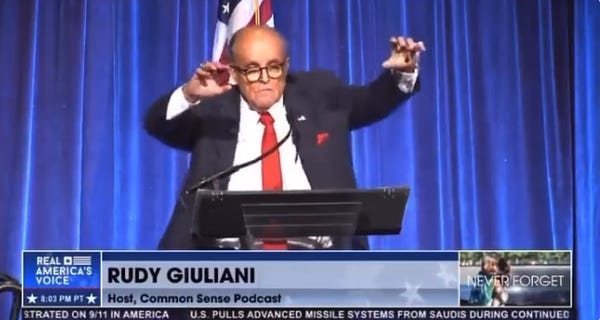 Rudy Giuliani's having a weird one. Yeah, that is obviously an evergreen statement. But he just needs you to know and understand and acknowledge that HE IS NOT DRUNK. Have we had this conversation before? It sure feels like it. Would we even be mad if Giuliani was drunk? After all, he's not allowed to practice law in New York or DC at the moment, which means he's probably got some time on his hands, and his life has probably never been in a darker place than it is right now, he's broke and under criminal investigation by the office he used to run.