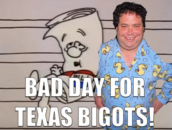 Pour one out for the bigots in the Lone Star State! Yesterday, their Show Us Your Junk bathroom bill died in committee , and a federal court threw out two of their congressional districts for discriminating against TexMexicans. How's a Texas bigot supposed to survive in the face of so much reverse racism? Sad!