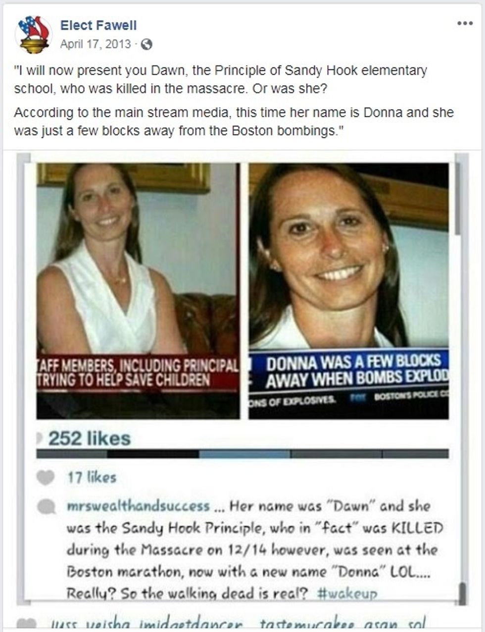 Those Deep State Shills at Media Matters dug into Fawell's Facebook page and found a bunch of other delights, too, like his revelation that the principal of Sandy Hook Elementary was definitely also an "eyewitness" to the Boston Marathon bombing, and there's no way anyone can say otherwise. Unless maybe that's all just nonsense.
