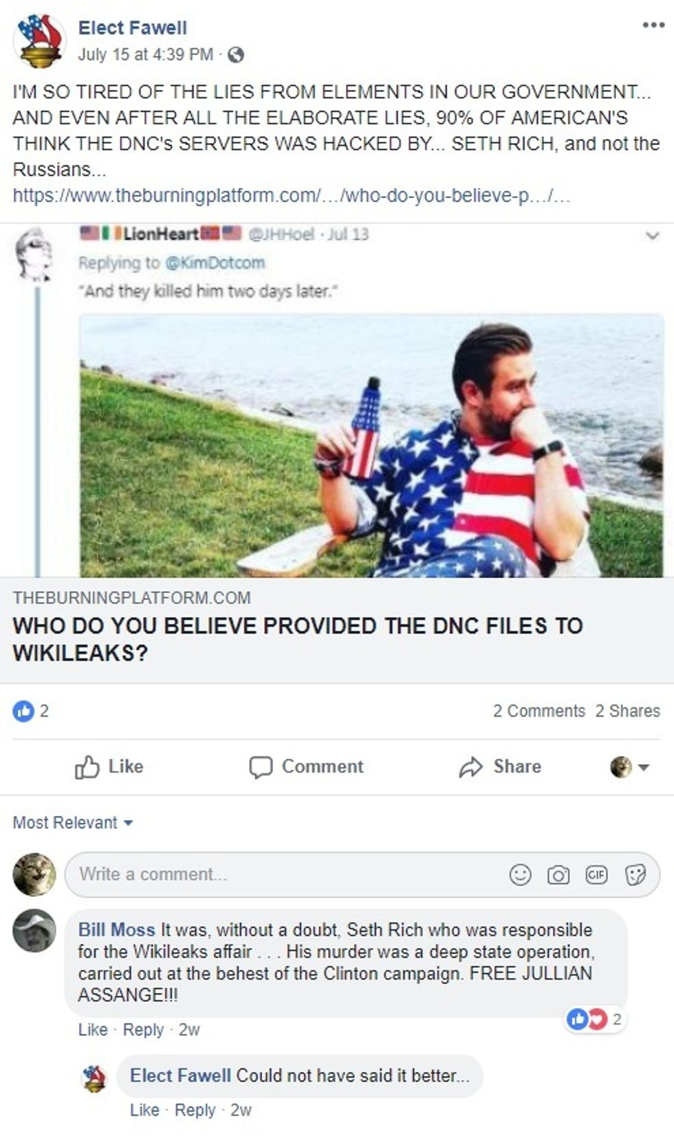 Also, Julian Assange is a political prisoner, put away by the Deep State because he knows the Truth about Seth Rich, which is that he was murdered by Hillary Clinton!!!!!! As proof of that "90% OF AMERICAN'S THINK THE DNC's SERVERS WAS HACKED BY... SETH RICH" thing, Fawell links to a blog post that contains the irrefutable proof: answers to a Twitter poll by highly respected conspiracy dipshit "Kim Dotcom," who's still out there bravely escaping Hillary's hit squads, somehow.