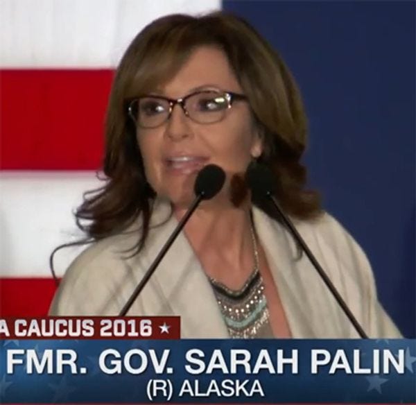 Sarah was not pleased by the suggestion that she'd been bought off, because nobody buys Sarah Palin, at least not in a scheme she hasn't concocted her own self. So at a Trump event in Cedar Rapids Monday, Palin explained that she thought King was her friend, but then he stabbed her in the back! Clearly, he had to be hiiiiigh, probably because he's been sucking down all those biofuels that Iowa is famous for: