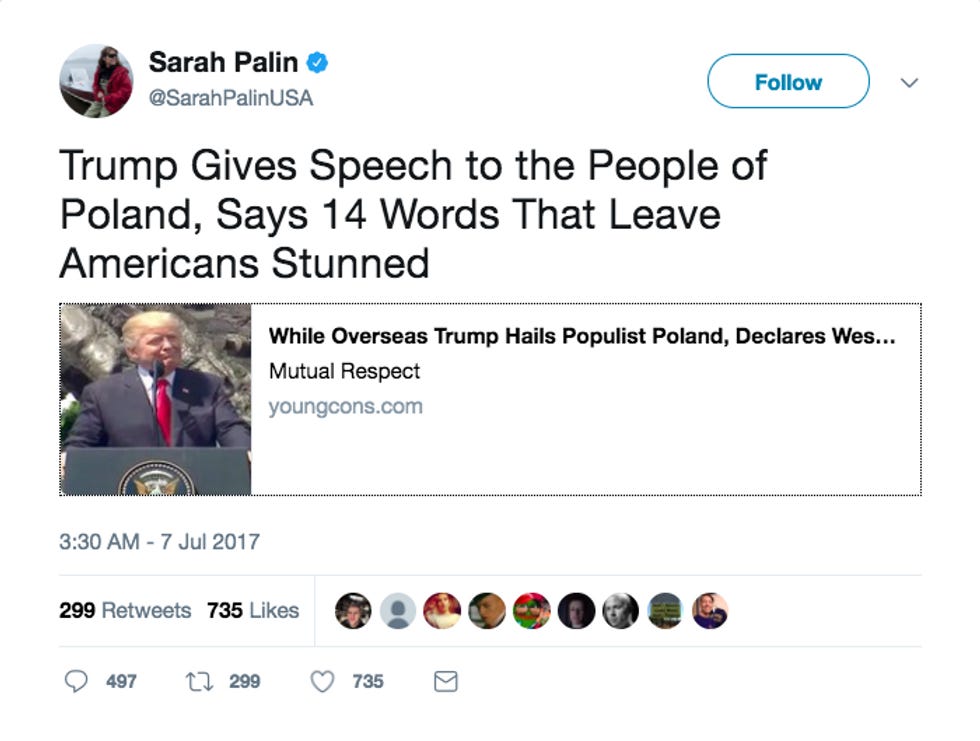 Nor does the article itself have any particular 14-word excerpts of Donald Trump's speech to the 23 percent of Poland that approves of him. There is literally no innocent interpretation of Palin's "14 Words" tweet; Wonkette, not being a Republican or a liar, double-checked.