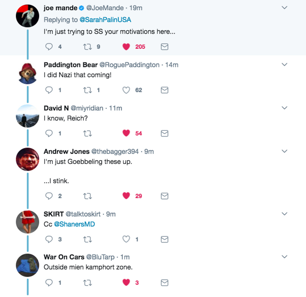 Today, Sarah Palin has taken to Twitter to spout Actual Nazi Words at us, and we don't mean like when the "alt right" kids pretend the "okay" sign is a white power symbol so we will fall for it and they can sue us. We mean: