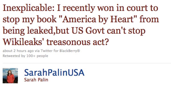 Why can't the U.S. military stop every single one of its soldiers from sending sensitive documents to Wikileaks? Because Sarah Palin is not currently commander-in-chief, of course. She, UNLIKE OBAMA, knows how to sue blogs.