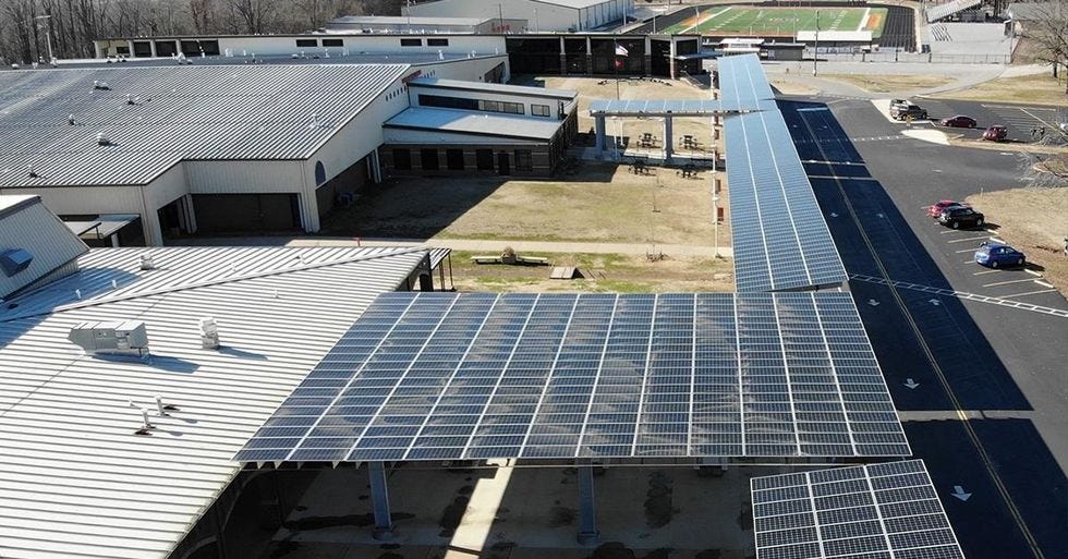 Back to the cool stuff: In Batesville, Arkansas, some school buildings have become local tourist destinations because they're novel enough that people want to snap a selfie with them in the background. The district put up solar canopies over the loading docks at the junior and senior high schools, which not only sheltered workers from sun and rain, but also attracted looky-loos. Superintendent Michael Hester called the canopies "the sexiest thing we've done," which may say more about Batesville than about the sexy, sexy solar. They're very nice panels , to be sure.
