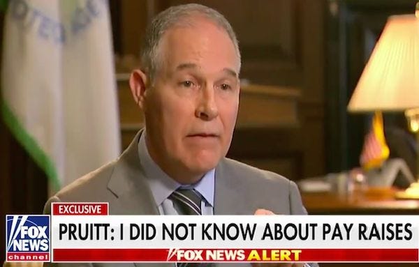 More big staff departures at the Environmental Protection Agency, of the sort that might remind one of the old expression about rats and ships, were it not for the fact that in Trumpland, the rats are all running the place. Two of Scott Pruitt's top aides, both of them part of the Oklahoma mafia he brought to Washington, resigned yesterday. And not just any old aides -- they were the very folks for whom Pruitt had arranged big raises, scheduling director Millan Hupp and senior counsel Sarah Greenwalt.