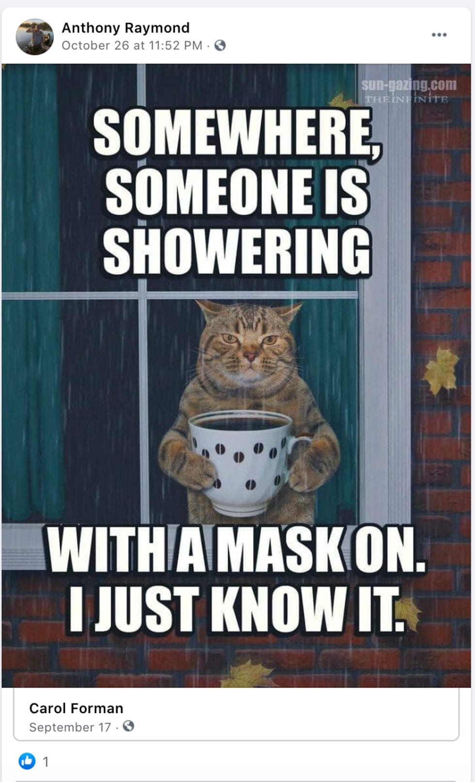 There are just a lot of memes and most of them are not political at all. I would say the vast majority are just cringe-inducingly corny — either bad jokes or the kind of #blessed motivational quotes one would traditionally find on Pinterest. There's a lot of "2020 is bad!" and "I love animals" memes. There are also a lot of "The next 12 people to like this post are my super cool best friends who will be invited to my post-corona party!" type posts ... with zero likes. It reads to me, personally, like he was just posting pretty much any meme he saw hoping to get interactions from other people, regardless of their content. He also had several posts mentioning "mental health" and "mental health awareness," that did not get too specific.