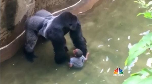 Cellphone video taken shortly after the boy got past a fence and fell 10 feet into the moat surrounding the gorilla habitat shows the boy in a corner of the enclosure; the gorilla, a 17-year old adult male named Harambe, grabs the boy and rapidly pulls him through the water, then pauses, stands the boy up for a moment, and then grabs the boy by the ankle and pulls him into another corner of the moat. You may not want to watch this.