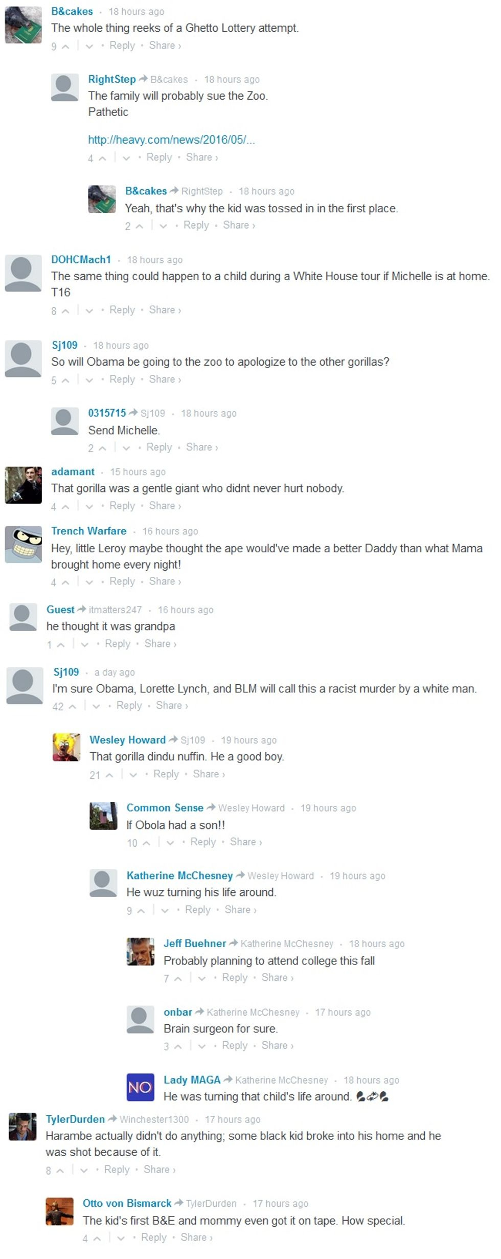 The cheerful red-meat-dispensers at Dead Breitbart's Home For Race Baiting got right to the point about how stupid black people are, finding three whole tweets blaming the shooting of the gorilla on "white privilege" before the child was identified as a black kid, and aren't Those People dumm? Needless to say, the wits were out in force in the comments on that story and another on the Cincinnati zoo; while most of the outrage was focused on the HORRIBLE PARENTS, there were nonetheless plenty of wags who just loved the hilarity of a dead gorilla, because HAW HAW black people are like gorillas!!!! (We've smooshed our screengrabs together here to present a collection of Breitbartians' finest efforts from both stories):