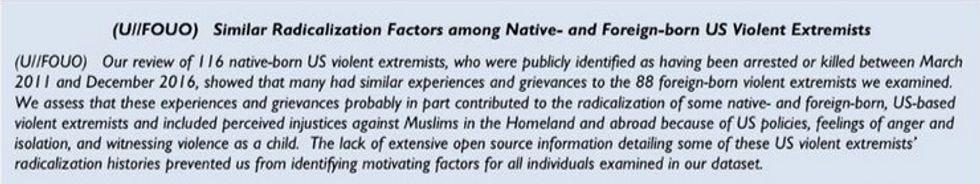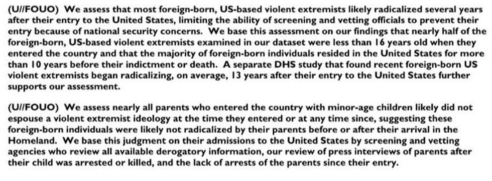 Maddow acknowledges she's no Woodstein and Bernward -- her show didn't get the document by doing any investigative work; it was dropped into their laps by a source who wanted this to get publicized. (We deeply appreciate how Trump's terrible policies have led government agencies to become leakier than a refugee raft.) And the document is a doozy; the I&A analysis is unclassified but marked "For Official Use Only," with a disclaimer indicating it shouldn't be made public. The analysis is based on publicly available information from academic and government sources, and covers people who were "indicted or killed" between the start of the Syrian civil war and December 2016. Notably, the report was coordinated with other government agencies, including Customs and Border Patrol (CBP), the State Department, Immigration and Customs Enforcement (ICE), the National Counter-Terrorism Center (NCTC), and U.S. Citizenship and Immigration Services (USCIS), so this isn't exactly a rogue DHS report.