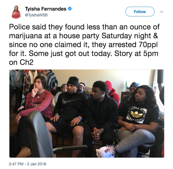 Instead, 70 people at a party were arrested, and 63 of those people were all charged for one single bag of weed that weighed less than an ounce - which we thought is supposed to be the amount that gets you in LESS trouble, amirite??? But instead the cops were like, welp, there's all of these people here and this one bag of weed no one will claim, so we are going to go ahead and take all of these people to jail because this one bag of weed is "in reach" of ALL SIXTY THREE people.