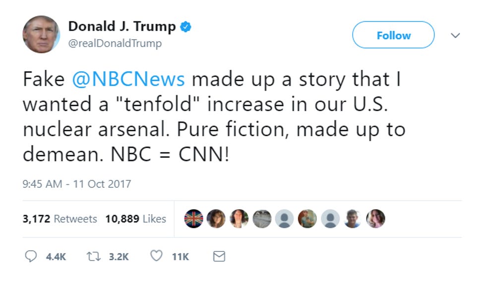 Trump baselessly tweeted in August that he had "renovated and modernized" our nuclear arsenal, because its granite countertops were out of date (all nuclear arsenal countertops are marble this year) and everybody agreed putting a few skylights in our missile silos would really brighten up the space. MAYBE he thinks that when he stomped his feet and clapped his hands in this July Pentagon meeting, after which his Sec State called him a fucking moron, the military immediately set to fixin' it up right nice to please President Pussgrab.