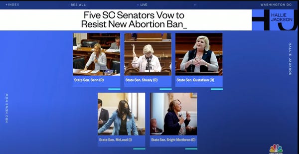 Men didn’t listen to women in South Carolina Tuesday, which is hardly a rare occurrence but the consequences this time are especially dire. Twenty-seven South Carolina state senators, an all-male forced-birth revue, passed a six-week abortion ban over the objections of five women state senators, three of whom are Republicans.