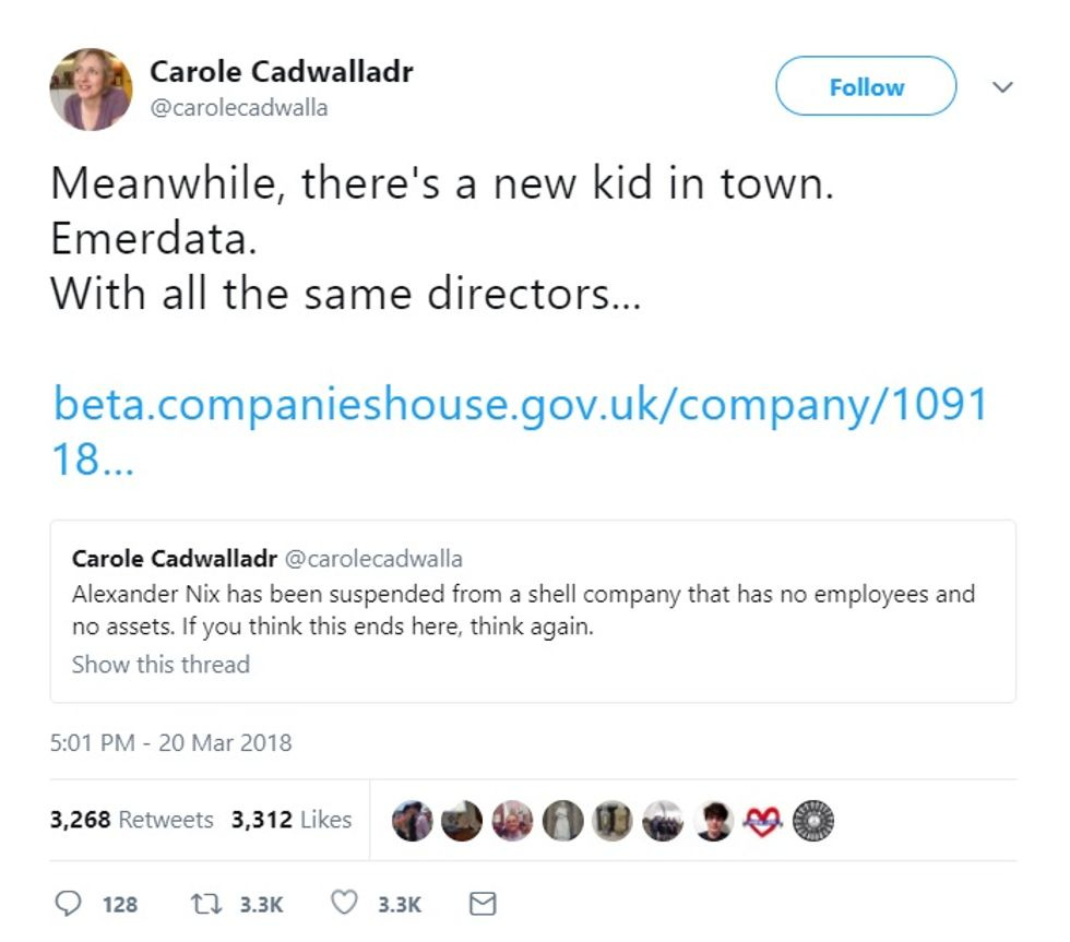 It's useful to remember that Cambridge Analytica is just the U.S. branch of the British company SCL Group, especially since a "new" company under a new name is suddenly emerging from CA's rubble, and weirdly it has all the same board members as CA, like Alexander Nix and Rebekah Mercer, whose heart is just BROKEN APART by this scandal and who has declared she is staying on the board of CA, because she wants to be "part of the solution," hahahahahaha go fuck yourself, Rebekah Mercer.