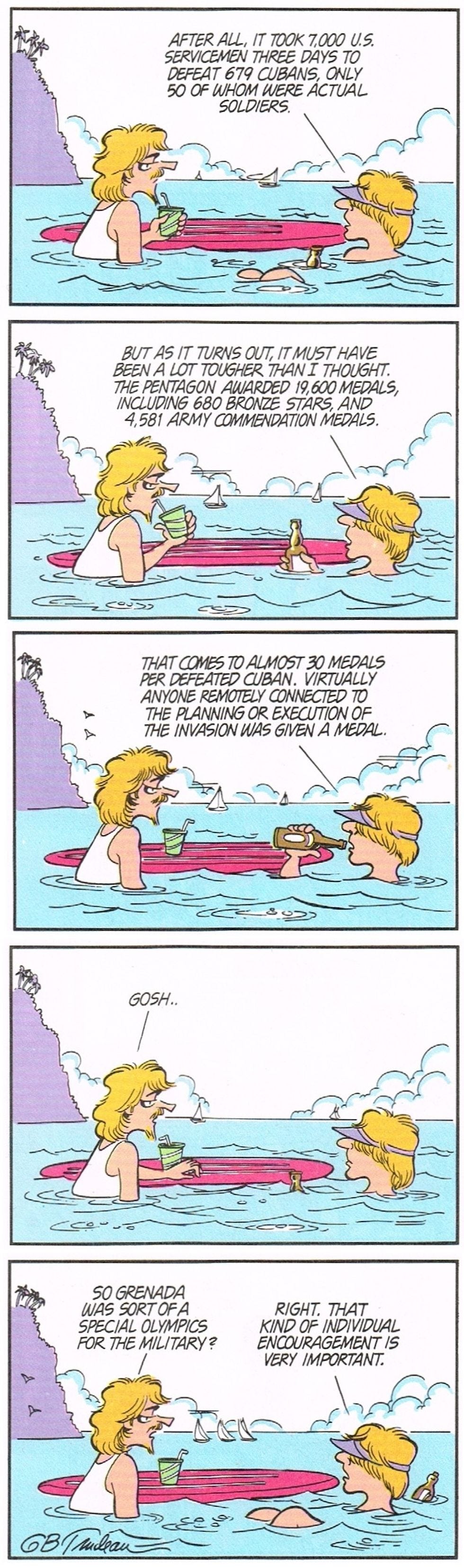Whew! That was a close one! Fidel Castro was on the verge of invading all of South America, but Ronald Reagan heroically saved the hemisphere! We'll close today's lesson with an alternative view of Grenada, via a Doonesbury Sunday strip from a few years after the invasion: