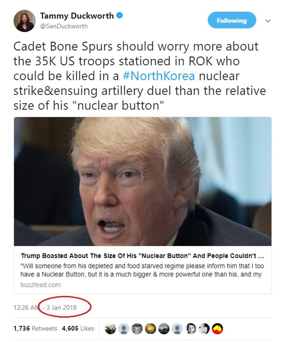 The Military Times attributes the "Cadet Bone Spurs" coinage to Duckworth, which sounds about right, but if some smarty with LexisNexus can find an earlier citation than that January 21 speech, we'll update.