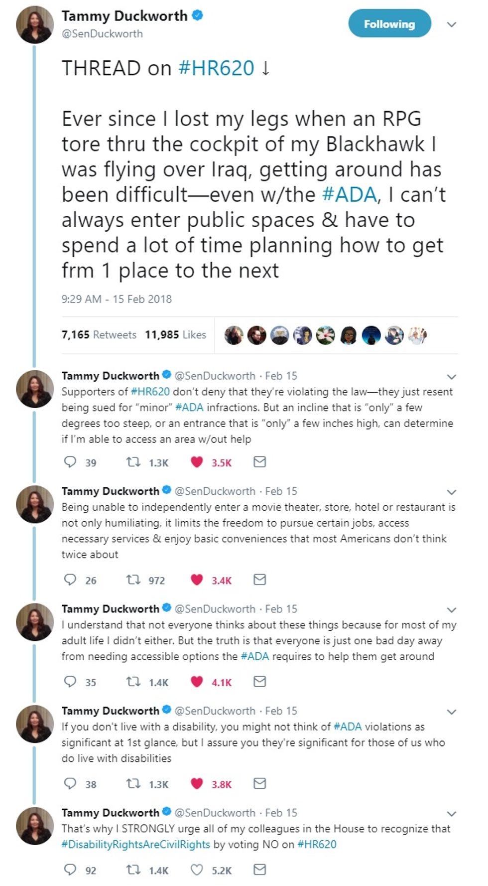 More recently, Duckworth has been fighting against a truly evil measure in the House that would limit "frivolous" lawsuits under the Americans with Disabilities Act. "Frivolous" to just whom, exactly, she asked in an excellent Twitter thread: