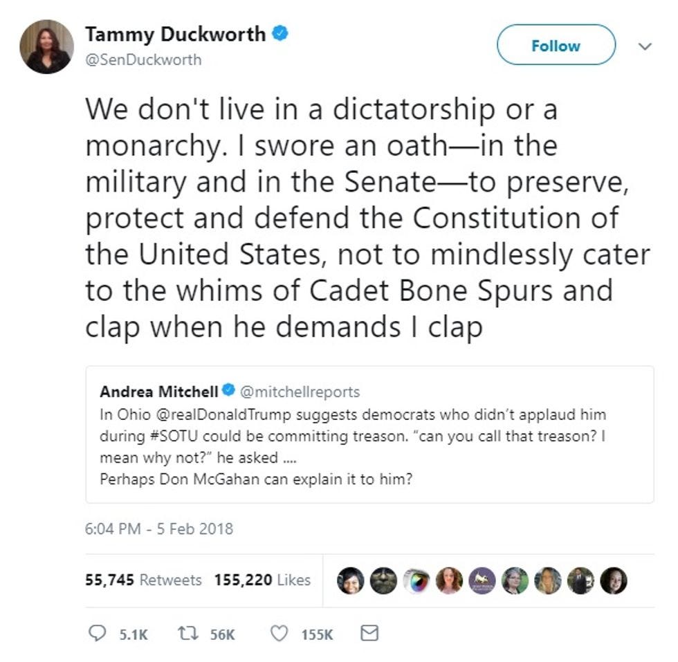 Before that, when Trump complained that Democrats were somehow hurting the military by insisting on helping DACA recipients, Duckworth was similarly not in the mood for his nonsense: