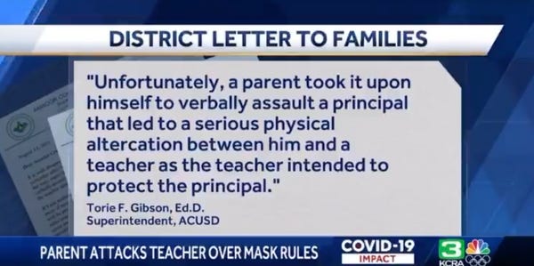 Uh, no, the “altercation" illustrates that a significant portion of the population is deranged and violent. This guy beat up a teacher because the school had a mask mandate. This is not normal behavior or reflective of reasonable debate. Right-wing media has helped promote the lunacy that students wearing masks is inherently in conflict with a “normal learning environment." COVID-19 outbreaks that shut down schools jeopardize the learning environment. It also doesn't help when students have to watch teachers and parents throw down in the school pickup area.