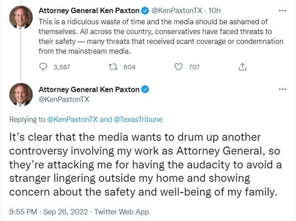 Texas Attorney General Ken Paxton fled his home yesterday — in a truck driven by his wife, state Sen. Angela Paxton — after a process server showed up to give him a subpoena for a hearing in federal court scheduled for today. The AG later took to Twitter to yell at people who'd mocked him because when you're a Republican public official, you live in constant danger from leftist murder squads or something.