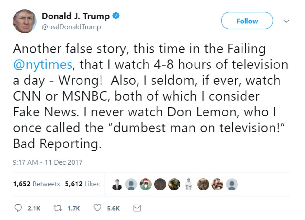 “I do not watch much television,” he insisted. “I know they like to say — people that don’t know me — they like to say I watch television. People with fake sources — you know, fake reporters, fake sources. But I don’t get to watch much television, primarily because of documents. I’m reading documents a lot.”