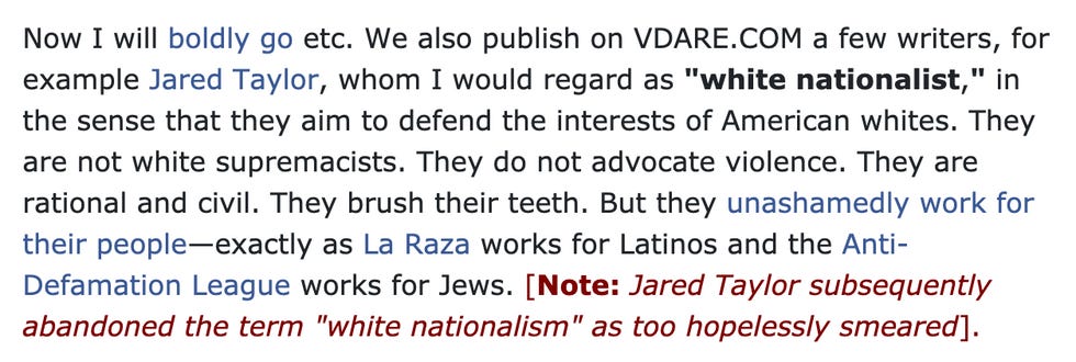 The site's owner and editor-in-chief, Peter Brimelow (ironically an immigrant himself, but he's a white person from England so it's OK) claims it is not actually a white nationalist site (which it very obviously is), while defending publishing Jared Taylor, explaining that his white nationalism is not bad on account of how he brushes his teeth.