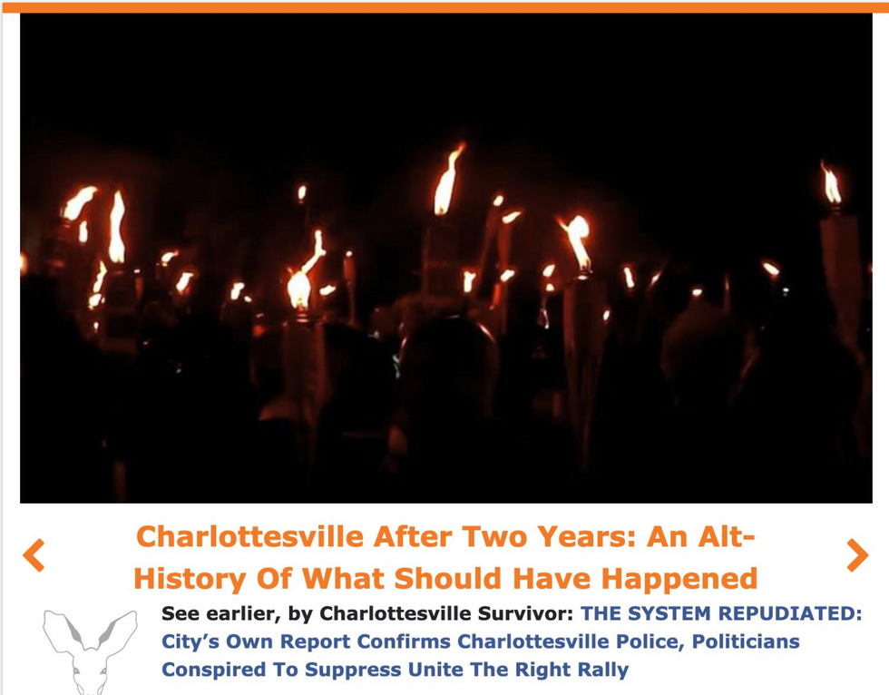 In case you are wondering exactly what kind of site VDare is, not only is it the kind of site that regularly publishes the work of one Ann Coulter and white supremacist Jared Taylor, it also published, just this week, frighteningly bad fan fiction about Donald Trump and Charlottesville. Said fan fiction involved everyone in the land collectively agreeing that the real problem with Charlottesville was not the several hundred creeps in polo shirts holding tiki torches and yelling "Jews will not replace us," but rather the Democratic legislators in the state and Antifa.