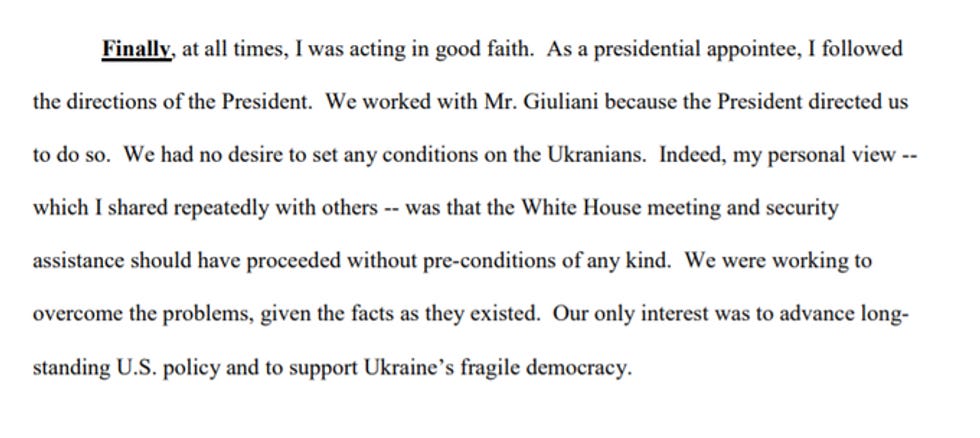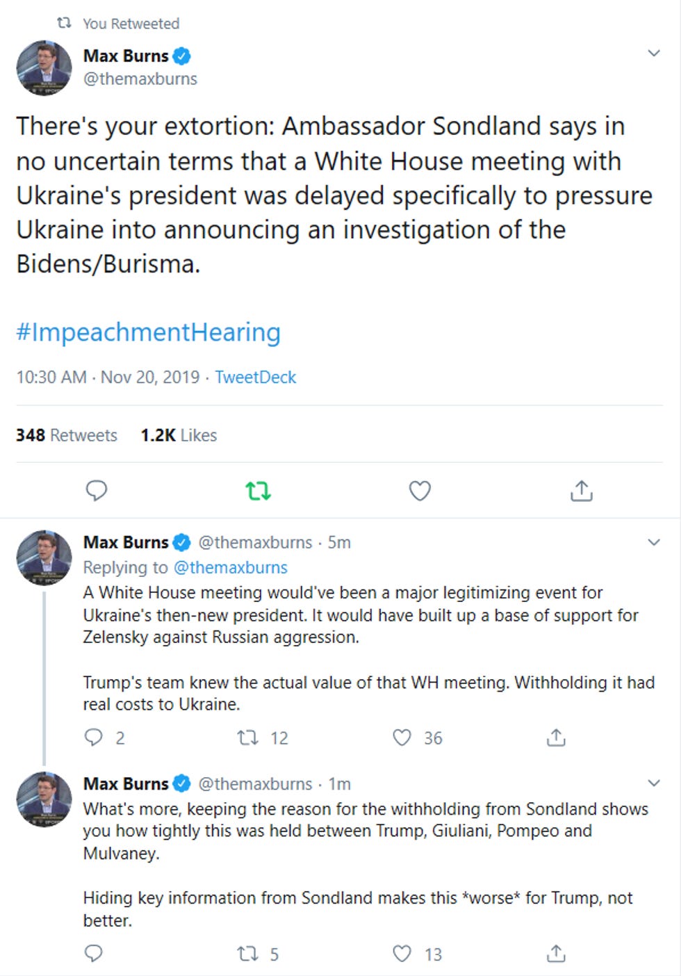 10: 27:Trump told Sondland "NO QUID PRO QUO! I just want Zelenskyy to do the right thing!" Translation: the "right thing" meant "do fake investigations to benefit me personally."