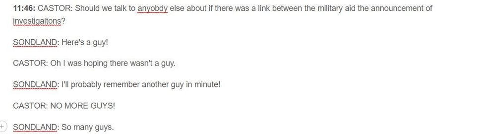 11: 56:CASTOR: Trump REALLY CARES about corruption in Ukraine, right? SONDLAND: Um, well, he said that. CASTOR: And you believed him, right? SONDLAND: I mean ... "believe" Trump? That is a strong word, sir.