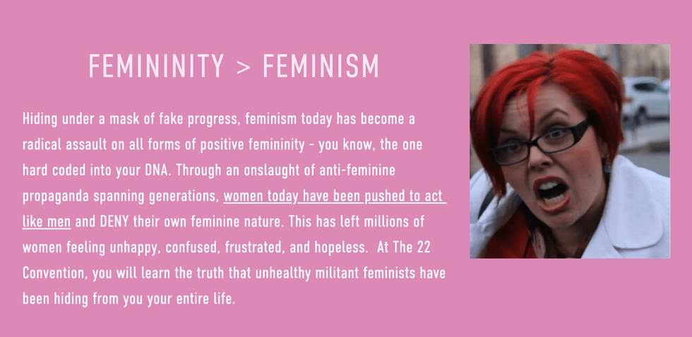 Hiding under a mask of fake progress, feminism today has become a radical assault on all forms of positive femininity - you know, the one hard coded into your DNA. Through an onslaught of anti-feminine propaganda spanning generations, women today have been pushed to act like men and DENY their own feminine nature. This has left millions of women feeling unhappy, confused, frustrated, and hopeless. At The 22 Convention, you will learn the truth that unhealthy militant feminists have been hiding from you your entire life.