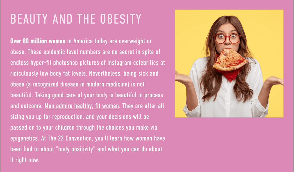 Over 80 million women in America today are overweight or obese. These epidemic level numbers are no secret in spite of endless hyper-fit photoshop pictures of Instagram celebrities at ridiculously low body fat levels. Nevertheless, being sick and obese (a recognized disease in modern medicine) is not beautiful. Taking good care of your body is beautiful in process and outcome. Men admire healthy, fit women. They are after all sizing you up for reproduction, and your decisions will be passed on to your children through the choices you make via epigenetics. At The 22 Convention, you'll learn how women have been lied to about "body positivity" and what you can do about it right now.