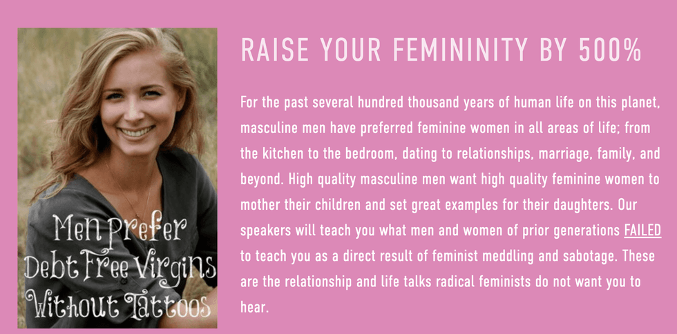 Yes! For the low, low price of $1,999 a ticket ($999 a ticket and a plus one if you act now!), you can learn all of the secrets to reeling in the kind of man who sits on YouTube all day whining about how women aren't all barefoot and pregnant anymore. Men like Stefan Molyneux, Mike Cernovich, and organizer Anthony Dream Johnson (who claims he is the 1st President of the Manosphere), along with a bunch of other creepy dudes you've never even heard of and definitely have no interest in speaking to for more than five minutes, never mind marrying.