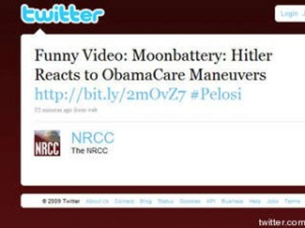 Yesterday the National Republican Congressional Committee thought that the most productive thing to do that afternoon would be to compare Nancy Pelosi to Hitler, on Twitter. A savvy web intern found some video of Adolf Hitler planning to kill Jews, only he's speaking in German (!), so what would be great would be if we could just throw up some subtitles that suggest that the kind of genocide Hitler thinks is even cooler is the kind when Barack Obama just FOR NO REASON decides to shut down America's hospitals. Which by the way are in Berlin, according to the Democrat/Nazi's map. In any event, like nearly everything else that happens on Twitter, it was later forcibly removed. [ CNN Political Ticker ]