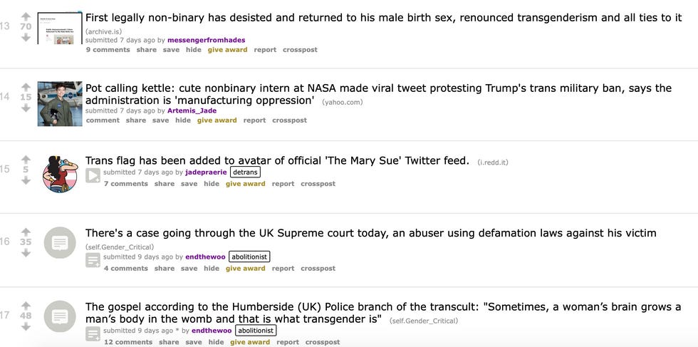 Pretty much any term used to describe them, even if it they made it up themselves, would eventually take on "slur"-like connotations because there is simply no appealing way of describing what it is they believe and do. Over on Reddit, they call themselves "Gender Critical," which sounds just as ridiculous as anything else. The r/GenderCritical forum is basically a super-ridiculous sub in which a bunch of assholes scream all day about how cisgender men are definitely going to pretend to be women in order to assault cisgender women, which is pretty fucking gross! I mean, what? Do they think it is not possible for a cisgender woman to assault another cisgender woman? Because that is definitely possible!
