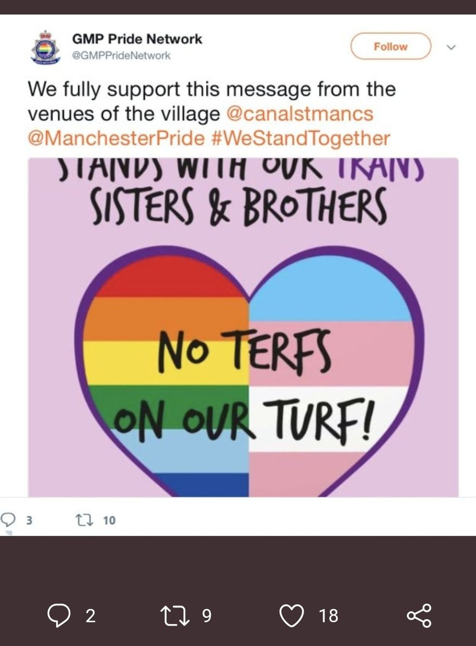 In other news, in England, a bunch of idiot TERFs freaked out over the Manchester Police tweeting out an image that said "No TERFs on Our Turf," complaining that TERF was a "slur" against "feminists."