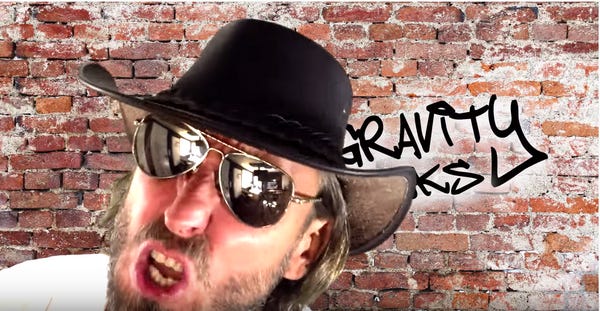 But hey! Who are we to dispute a guy who calls himself "Flat Earth Man"? He is very smart! So smart, in fact, that he also knows that gravity isn't real. Remember when we used to counter the creationists who did the whole "Evolution is just a THEORY. Says so in the name, the THEORY of evolution!" thing with "So what, you don't believe in the THEORY of gravity now either?"