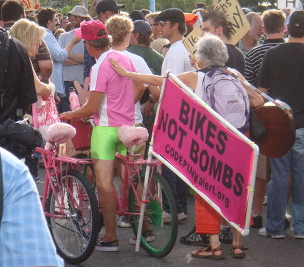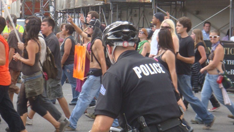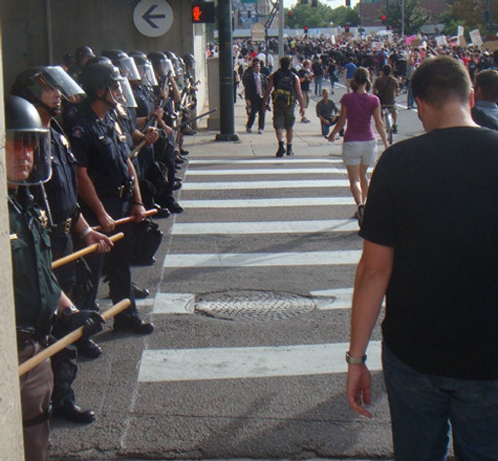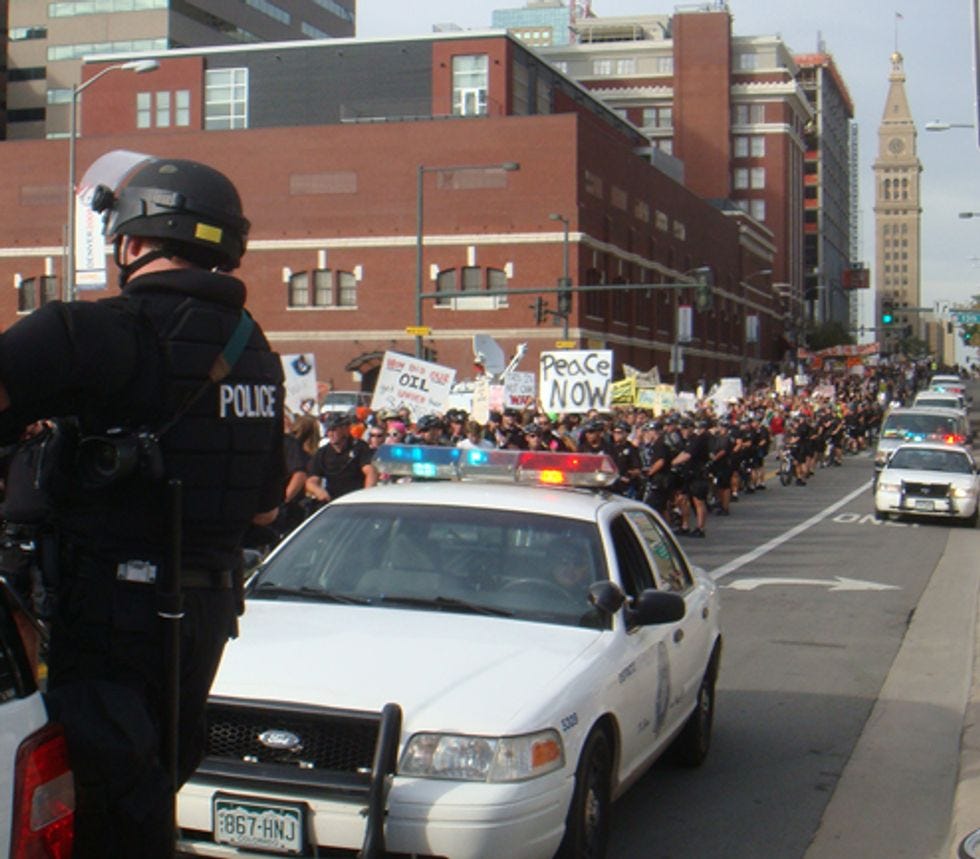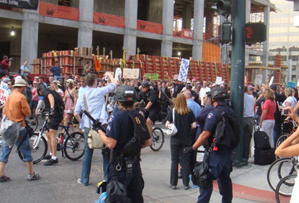 On our 17-mile march from downtown Denver to "The Perimeter," which is a police blockade at least another 17 miles from the actual Pepsi Center, we ran into these friends. Thousands of riot cops, thousands of hippies, thousands of blocked crossways and pedestrian routes to The Perimeter. They are protesting Barack Obama's War in Iraq, as well as the fact that anyone is dying anywhere in the world. Let's immanentize their eschaton, after the jump.