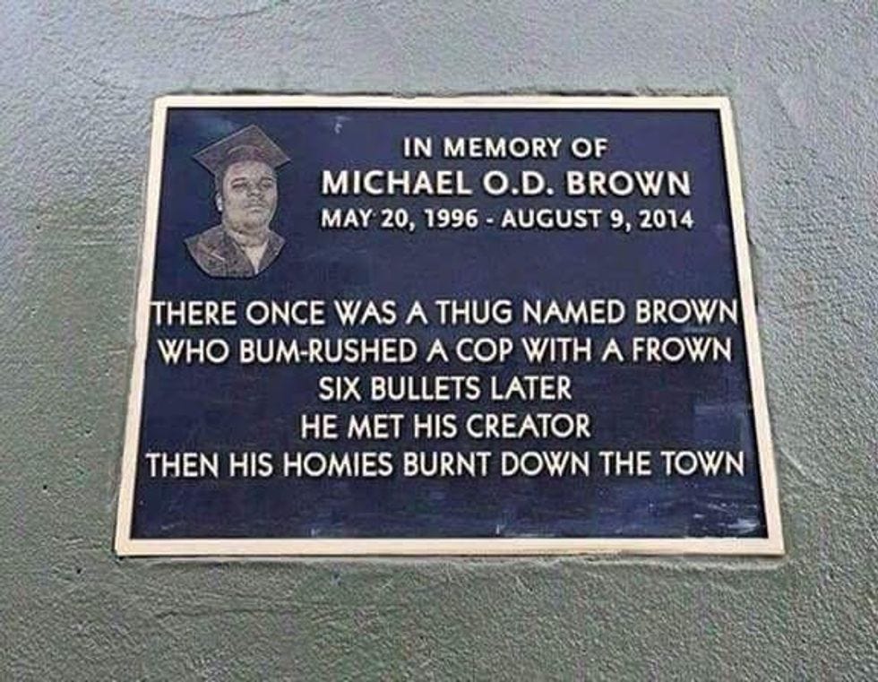 The bulk of Mr. White's work is far less... shall we say... subtle in its meaning. Consider this example, a "monument" to Michael Brown: