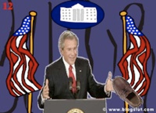 You people are very on top of things, aren't you? You say, "Ha ha it would be funny to have a game like the EcoDriving USA game, only with throwing shoes at George W. Bush," and voila, here it is! You win if you get to 10 points before you have a seizure. [ blogslut ]